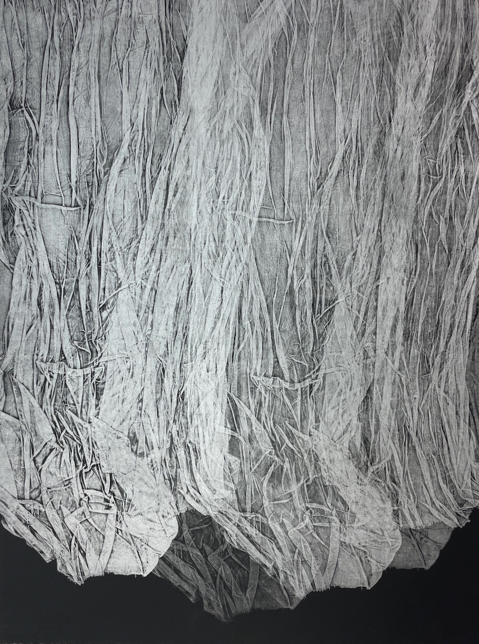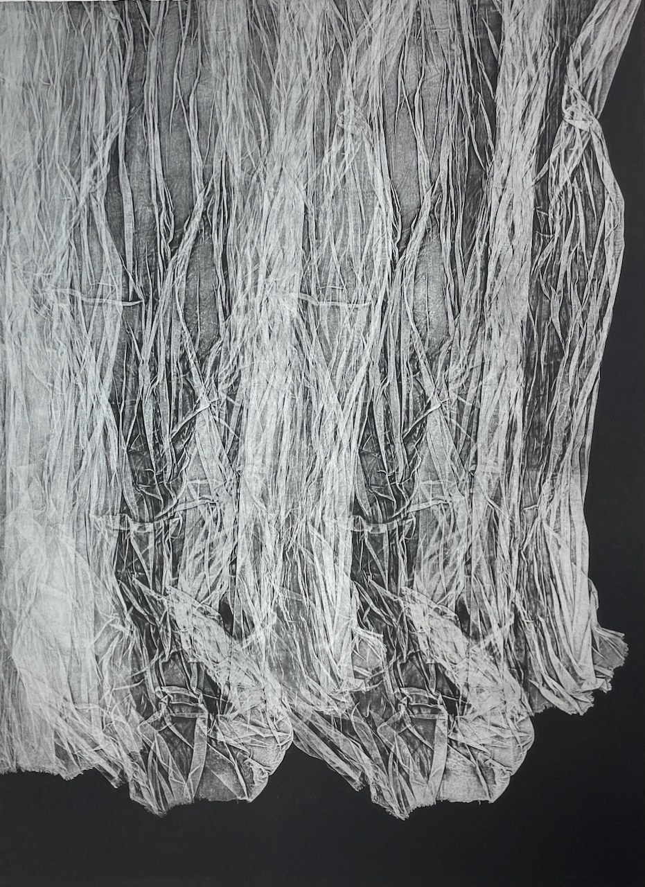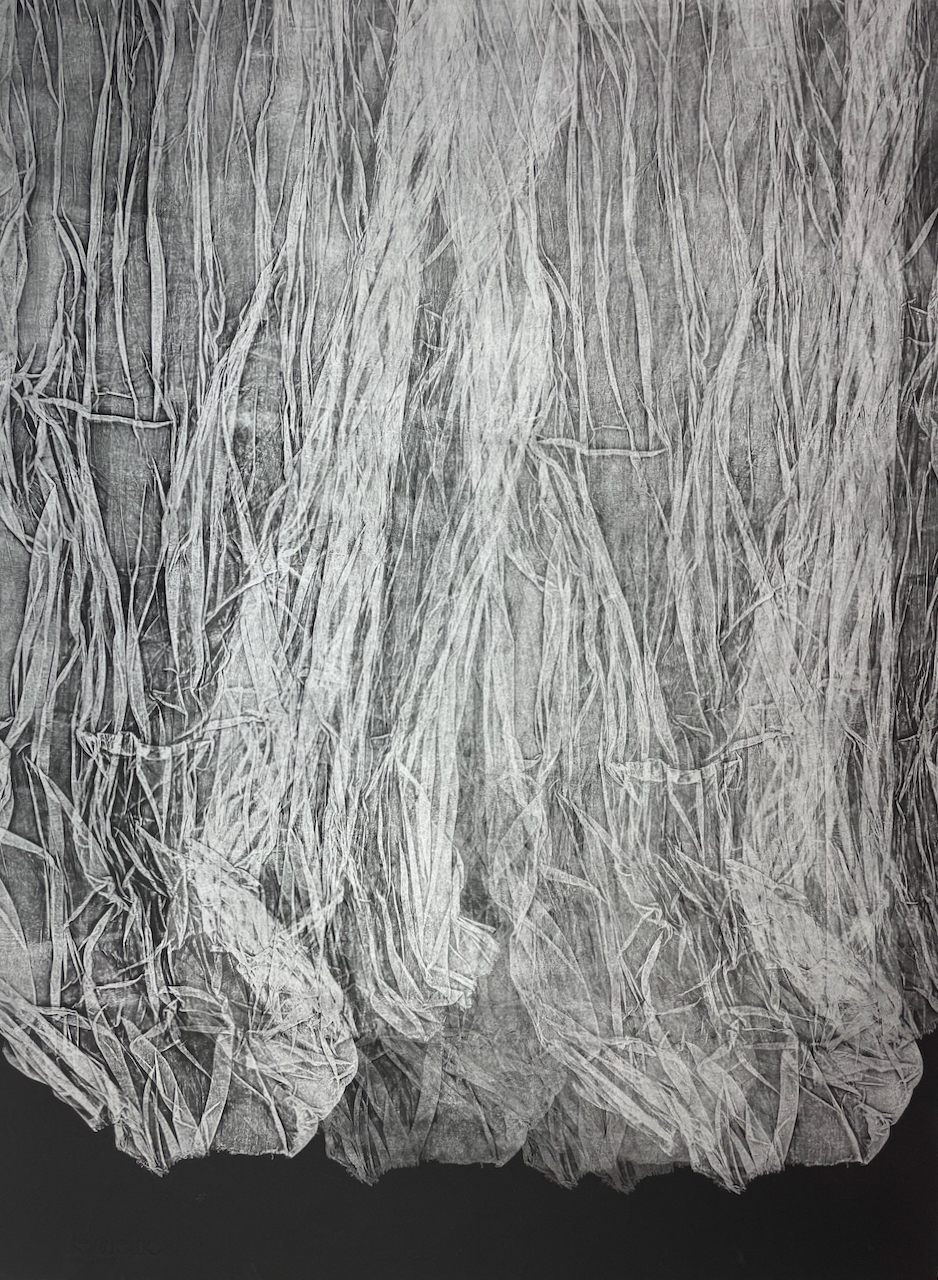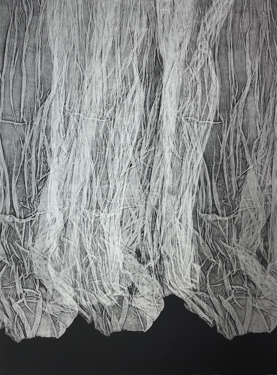 Monoprints exploring patterns and gestures created by printing fabric. The printing is repeated and juxtaposed in different nuanced visual formulations. They are visual meditations and experiments inspired by looking at light through curtains. By making multiple impressions and playing with over printing layers to create transparent and opaque areas, the images suggest both solidity and fragility and patterns of flux and motion.