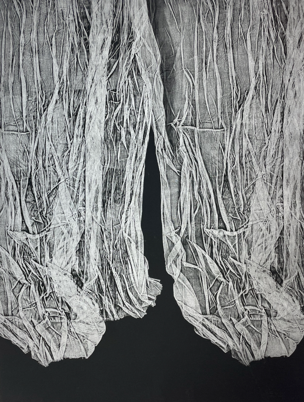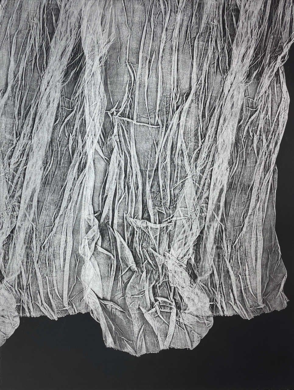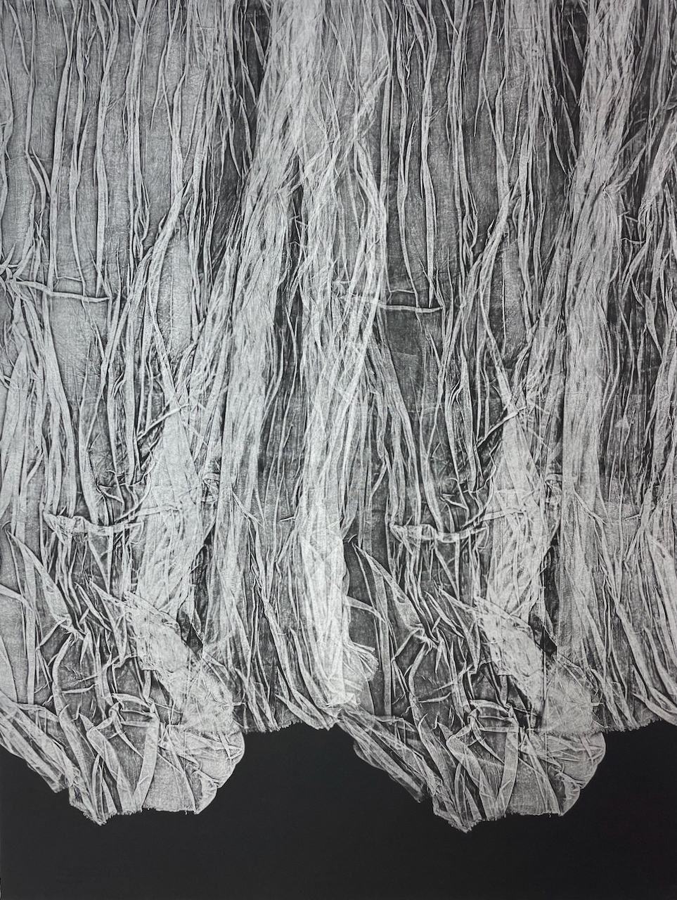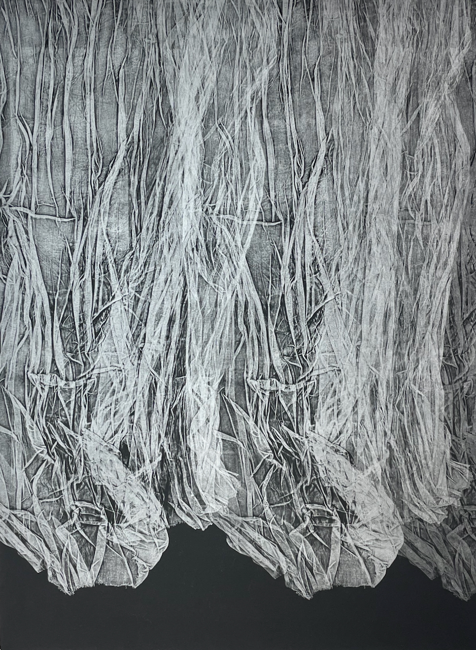 Monoprints exploring patterns and gestures created by printing fabric. The printing is repeated and juxtaposed in different nuanced visual formulations. They are visual meditations and experiments inspired by looking at light through curtains. By making multiple impressions and playing with over printing layers to create transparent and opaque areas, the images suggest both solidity and fragility and patterns of flux and motion.